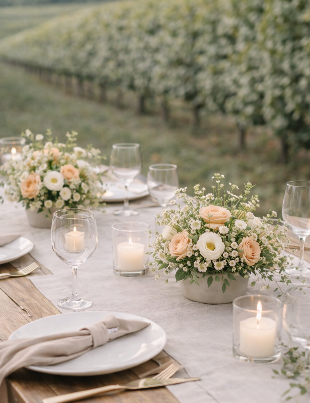 A refined floral setting for intimate gatherings, thoughtfully designed with seasonal blooms and natural textures.
